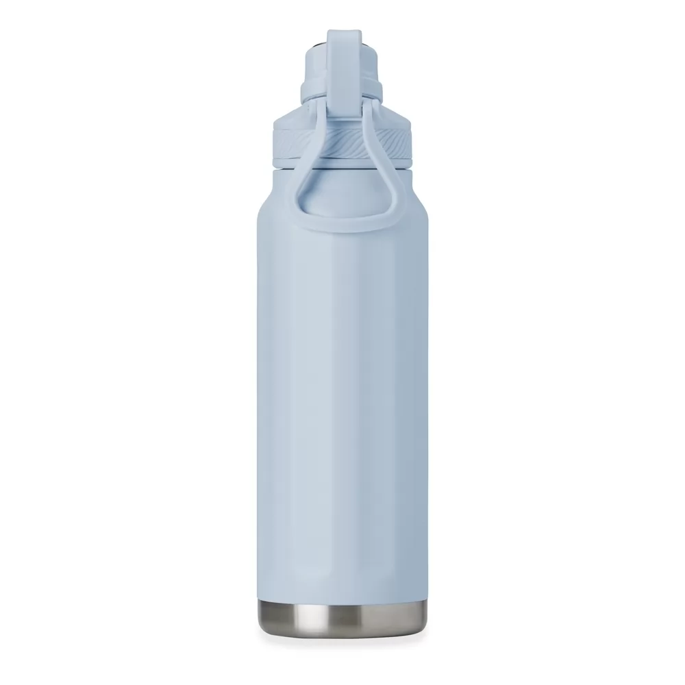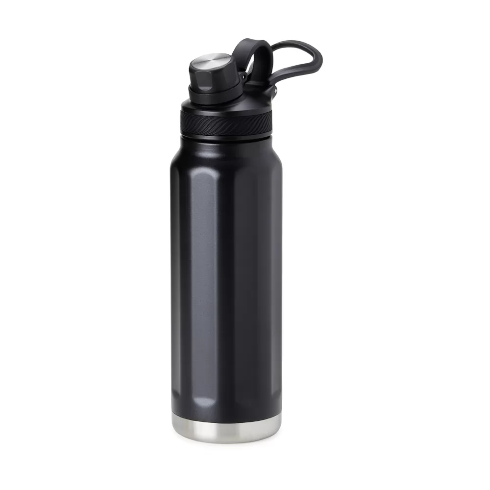 Garrafa térmica feita em inox 304 de parede dupla com capacidade de 950ml. Com design de faixas em relevo, a garrafa possui tampa com alça para transporte e tampa de proteção para o bocal.